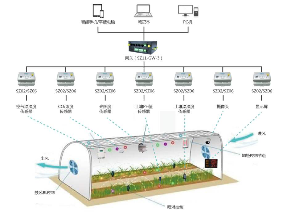 以生態(tài)溫室為例,隨著遠程監(jiān)控系統、無線傳感器監(jiān)測等技術日趨成熟,物聯網、大數據等技術已逐步應用到了生態(tài)農業(yè)建設中。通過環(huán)境、動植物信息檢測,溫室農業(yè)大棚信息檢測和標準化生產監(jiān)控,精準農業(yè)中的節(jié)水灌溉等應用模式,提高了農業(yè)生產的管理效率、提升了農產品的附加值、加快了智慧農業(yè)的建設步伐。其主要方式通過安裝于指定的監(jiān)測點的空氣溫濕度傳感器、土壤溫濕度傳感器、土壤PH傳感器、光合有效輻射傳感器、CO2傳感器等設備實時監(jiān)測空氣的溫濕度、二氧化碳濃度、土壤溫濕度及PH值等相關數據;聯動控制系統由加熱、噴灌、通風、卷簾設備及其配套PLC及Wifi設備服務器組成,當傳感器采集的環(huán)境數據與標準值對比超出臨界范圍時,控制器自動啟動相關硬件設備對作物生長環(huán)境加熱、澆水、通風、卷簾加減光照輻射,實現作物生長過程精確控制。同時在塑膜日光溫室旁,建立地下沼氣池,沼氣池上方建圈舍及廁所,形成一個封閉的智慧化能源生態(tài)系統。在此系統內,圈舍溫度在冬天提高3~5℃,為禽畜提供了更適宜的生長條件,使豬的生長期大幅縮短約150天。禽畜糞便為沼氣池提供原料,產出的沼氣用于家庭供暖,殘留的沼渣、沼液作為溫室作物的肥料。此外,豬等禽畜呼吸排出的CO2可促進溫室內作物光合作用,蔬菜產量和質量明顯提高。