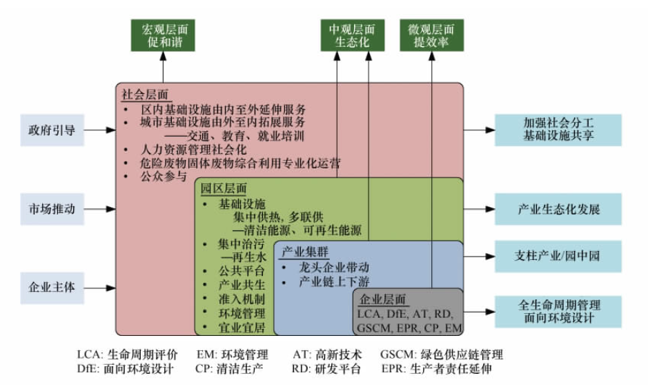 環(huán)保部組織出版了《中國生態(tài)工業(yè)園區(qū)建設模式與創(chuàng)新》,集中展現了多年以來國家生態(tài)工業(yè)示范園區(qū)的建設模式、特色與成效,總結梳理了一系列典型案例,并從6個方面凝練出現階段國家生態(tài)工業(yè)示范園區(qū)的主要建設模式,包括(1)企業(yè)層面以生態(tài)設計、綠色技術、節(jié)能降耗、環(huán)境管理為抓手推動生態(tài)化發(fā)展;(2)基于物質代謝、水資源高效利用、能量梯級利用及基礎設施共享推進產業(yè)共生發(fā)展;(3)老工業(yè)基地向高新技術轉型、二三類產業(yè)協調融合發(fā)展,及傳統制造業(yè)向戰(zhàn)略性新型產業(yè)轉型促進產業(yè)轉型升級;(4)基于廢物循環(huán)利用的靜脈產業(yè)發(fā)展模式;(5)以流程工業(yè)為支柱且行業(yè)特征突出的園區(qū)集成創(chuàng)新實現資源能源高效利用;(6)在省會城市等大型城市布局的園區(qū)深化科技創(chuàng)新驅動生態(tài)產業(yè)發(fā)展。