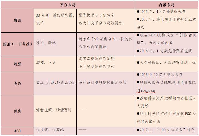 以BAT為首的機構(gòu)重金加速布局短視頻平臺。今日頭條、騰訊、秒拍等均投入10億元扶持短視頻內(nèi)容創(chuàng)業(yè)者。阿里投入20億元進軍短視頻領(lǐng)域,將土豆網(wǎng)打造為專門的短視頻平臺。騰訊專門成立短視頻中心,負責短視頻平臺運行;愛奇藝短視頻平臺的愛奇藝頭條正在內(nèi)測;秒拍成為新浪微博獨家短視頻應用,從工具型短視頻機構(gòu)轉(zhuǎn)型為社交分享類短視頻平臺;華人文化基金領(lǐng)投的資訊類短視頻平臺梨視頻也已形成業(yè)內(nèi)影響力;咪咕視訊作為中國移動在視頻領(lǐng)域的唯一版權(quán)運營實體,也布局短視頻,與中央電視臺共建業(yè)內(nèi)領(lǐng)先的短視頻創(chuàng)作者聚集平臺,打造頭部賬號體系,孵化自有明星短視頻賬號,引入知名工作室直接簽約,盤整已有的強IP資源賬號化運作。