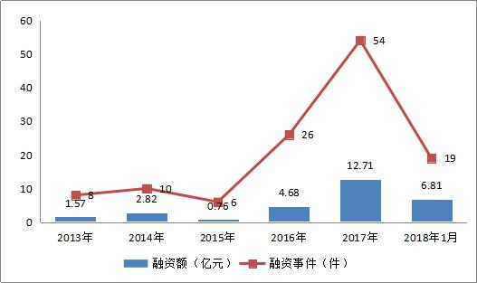 區(qū)塊鏈項(xiàng)目融資從2013年至2016年呈小幅上漲趨勢(shì)。由于2015年的政策監(jiān)管,導(dǎo)致2015年區(qū)塊鏈的投資熱度有所下降,在2017年VC大舉入局,投資額達(dá)12億。2018年1月,區(qū)塊鏈行業(yè)融資額和融資事件已經(jīng)超過2016年。