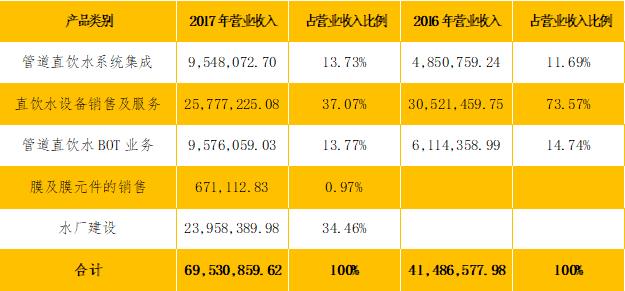 公司的主營(yíng)業(yè)務(wù)為管道直飲水系統(tǒng)BOT業(yè)務(wù)、管道直飲水系統(tǒng)集成、直飲水設(shè)備的生產(chǎn)、銷(xiāo)售及服務(wù),其收入按產(chǎn)品類別列示如下: