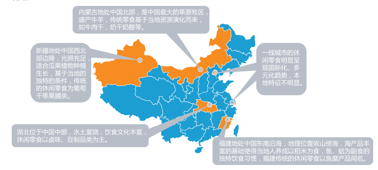 休閑食品的生產(chǎn)與農(nóng)業(yè)資源緊密相連。不同的地域有著截然不同的農(nóng)業(yè)資源,產(chǎn)業(yè)集中度較高,由此形成了眾多具備獨(dú)特資源優(yōu)勢的休閑食品品類,引領(lǐng)著中國休閑食品的發(fā)展潮流。目前,已經(jīng)興起了諸如福建軍團(tuán)、安徽炒貨軍團(tuán)、湖南辣食品、河南速凍食品軍團(tuán)等一大批優(yōu)秀的休閑食品企業(yè)。