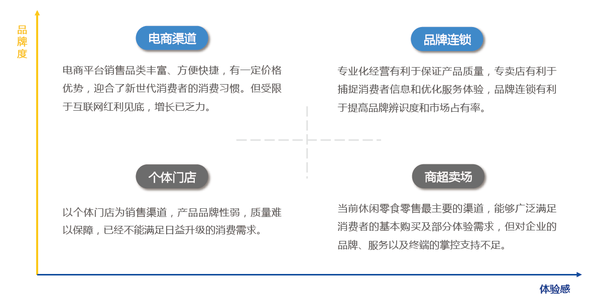 休閑零食的渠道陣營主要有四大類:傳統(tǒng)的個體門店和商超賣場,新興的品牌連鎖和電商渠道。在新零售浪潮的沖擊下,四大陣營此消彼長,個體門店的市場份額不斷縮減,商超賣場的渠道影響力也將減弱,品牌連鎖和電商渠道將成為未來休閑零食新消費(fèi)的主流渠道。