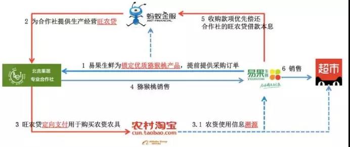 例如:天貓超市的供貨電商易果生鮮與陜西周至縣北吉果蔬專業(yè)合作社簽訂采購協(xié)議。螞蟻金服基于采購訂單,在對訂單進行識別并確認后,由網商銀行為合作社數(shù)百名果農社員提供低息貸款,果農拿到這筆貸款后,通過定向支付工具專項用于從農村淘寶購買指定的農藥、農資、農具。最后果品通過易果生鮮進駐天貓超市進行銷售。這種基于產業(yè)鏈形成的閉環(huán)信貸模式,突破了商業(yè)銀行傳統(tǒng)的評級授信要求,也無須另行提供抵押、質押、擔保,提供的資金效率高、環(huán)節(jié)更簡單,利率則遠低于民間借貸。