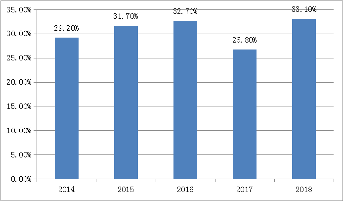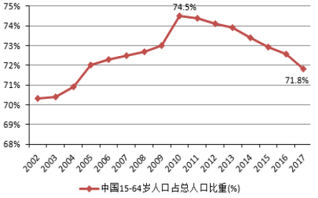 近年來,中國人口結(jié)構(gòu)發(fā)生了巨大變化,15-64歲勞動適齡人口占總?cè)丝诘谋戎刈?011年以來呈現(xiàn)逐步下滑的趨勢,2017年該比重已經(jīng)下滑至71.8%,相比2010年的最高點(diǎn)降低了2.7個百分點(diǎn)。另外,中國社會的老齡化問題更加嚴(yán)重,中國人口紅利逐步消失,目前已經(jīng)出現(xiàn)了劉易斯拐點(diǎn)。人口結(jié)構(gòu)的變化,勞動力供給條件的變化顯著的推高了我國的勞動成本,不僅削弱了制造業(yè)的競爭力,對勞動密集型的產(chǎn)業(yè)同樣也帶來了嚴(yán)峻的挑戰(zhàn),也削弱了中國產(chǎn)品在全球市場的競爭力。
