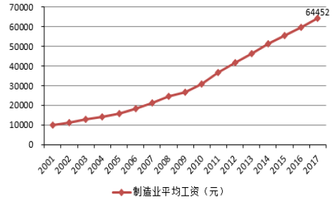 除了未來勞動力不足之外,中國制造業(yè)員工的平均工資則呈現(xiàn)逐年增長的態(tài)勢,2017年已升至64452元,同比增長8.4%。勞動力成本不斷上升,用機(jī)器人代替人工也是更加經(jīng)濟(jì)、符合市場規(guī)律的必然選擇。目前,“世界工廠”正不斷的從中國向東南亞等其他國家和地區(qū)轉(zhuǎn)移,中國改革開放初期借助人口紅利快速發(fā)展的條件已然不復(fù)存在。解決勞動力不足、勞動力成本上升的主要途徑就是智能制造,即生產(chǎn)過程的自動化、智能化產(chǎn)業(yè)升級。未來通過產(chǎn)業(yè)的轉(zhuǎn)型升級更加注重質(zhì)量和效益的提升,“機(jī)器代人”的生產(chǎn)方式將會更加普遍。