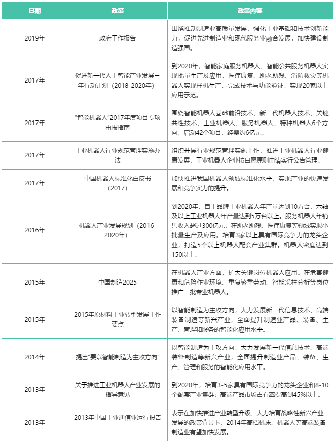 智能制造是“中國制造2025”發(fā)展規(guī)劃的重要發(fā)展方向,是未來制造業(yè)發(fā)展的必然趨勢,工業(yè)機(jī)器人是智能制造的關(guān)鍵設(shè)備,行業(yè)發(fā)展?jié)摿薮?。近年來,國家出臺了一系列的政策支持和鼓勵中國工業(yè)機(jī)器人行業(yè)的發(fā)展。根據(jù)2016年國務(wù)院發(fā)布的《機(jī)器人產(chǎn)業(yè)發(fā)展規(guī)劃(2016-2020年)》,到2020年,我國工業(yè)機(jī)器人產(chǎn)量達(dá)到10萬臺,六軸及以上工業(yè)機(jī)器人年產(chǎn)量達(dá)到5萬臺以上;培育3家以上具有國際競爭力的龍頭企業(yè);機(jī)器人密度達(dá)到150以上。