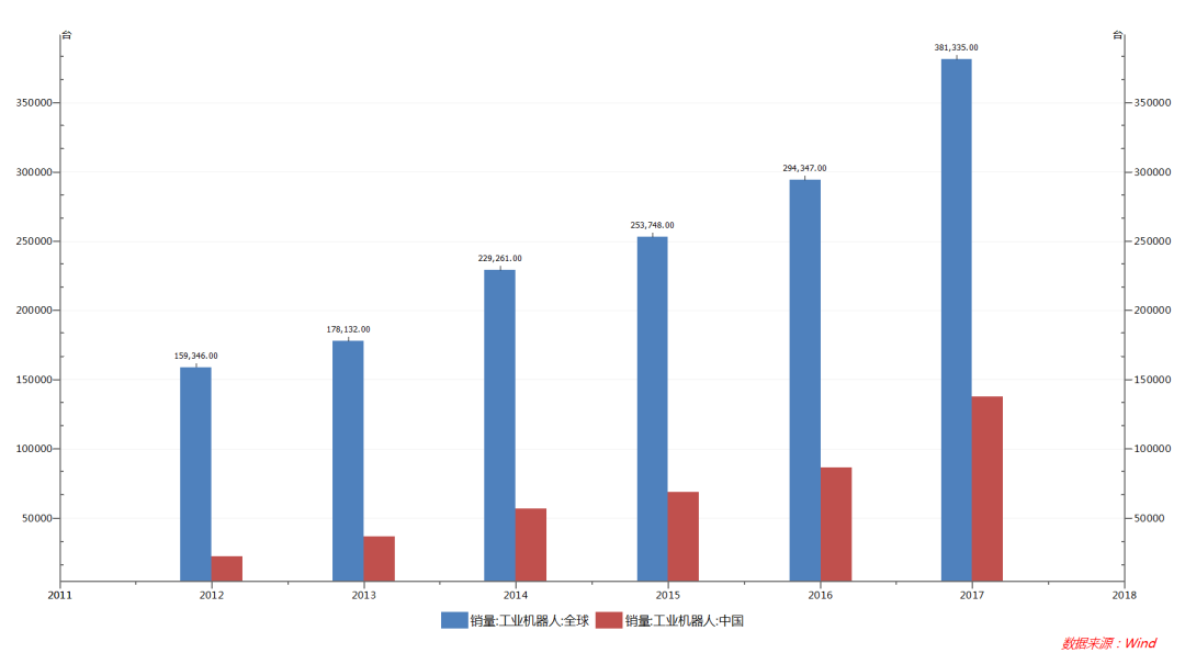 中國自2013年起成為了全球工業(yè)機(jī)器人最大的市場,2017年,中國工業(yè)機(jī)器人銷量達(dá)14.1萬臺,同比增長62.1%,全球工業(yè)機(jī)器人銷量為38萬臺,中國占全球的比重高達(dá)37%。中國工業(yè)機(jī)器人銷量不僅總量較大,而且增速也比較快,2011-2017年銷量年均增速高達(dá)39.5%。