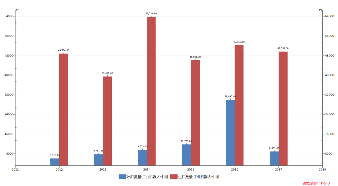 中國工業(yè)機(jī)器人進(jìn)出口數(shù)量(臺)