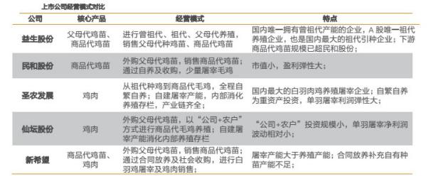 從2010年益生股份上市之后,A股就已經(jīng)有了完整了白羽肉雞產(chǎn)業(yè)鏈。目前共有5家上市公司——民和股份、益生股份、圣農(nóng)發(fā)展、仙壇股份、新希望——擁有相關(guān)業(yè)務。各家的側(cè)重點略有不同。