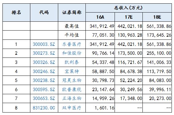 通過對植入器械上市公司的盈利做出預(yù)測,上市公司總收入的平均值在2017年、2018年預(yù)計分別是130,963.28萬元、173,645.26萬元,相對于2016年的77,051.30萬元,呈現(xiàn)逐年增長的趨勢;其上市公司盈利最高值預(yù)測值在2017年、2018年分別達(dá)到442,021.18萬元、561,338.86,相較于2016年的341,912.49萬元,呈現(xiàn)逐年增長的趨勢,市場總體看好植入器械上市公司。