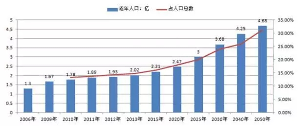 2004年底,中國60歲及以上老年人口為1.43億,2013年我國60歲及以上老年人口達(dá)2億人。截止2016年底,我國60歲以上的老齡人口高達(dá)2.3億人,位居世界之首。20世紀(jì)后期,為控制人口的急劇增長,國家推行計(jì)劃生育政策,使得人口出生率迅速下降,加快了中國人口老齡化的進(jìn)程。由于下世紀(jì)前半葉人口壓力仍然沉重,還要繼續(xù)堅(jiān)持計(jì)劃生育的國策,其結(jié)果將不可避免地使中國提早達(dá)到人口老齡化高峰。在第六次全國人口普查主要數(shù)據(jù)顯示,我國60歲及以上人口占13.26%,比2000年人口普查上升2.93個(gè)百分點(diǎn),其中65歲及以上人口占8.87%,比2000年人口普查上升1.91個(gè)百分點(diǎn),而且老年人口比例還以每年超過3%的速度增長,預(yù)計(jì)2025年將達(dá)到19.7%,到那時(shí),每五個(gè)中國人就有一個(gè)是60歲以上的人。按國家統(tǒng)計(jì)局2005年出版的報(bào)告,現(xiàn)在出生的中國人,男性平均壽命是69.6歲,女性的預(yù)期壽命是73.5歲。
