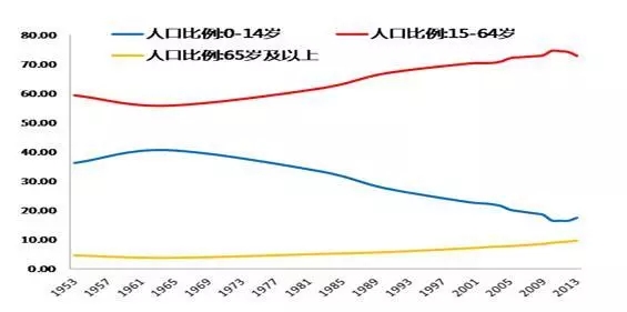 65歲以上老年人占總?cè)丝诘谋壤龔?%提升到14%,發(fā)達(dá)國家大多用了45年以上的時(shí)間。中國只用27年就可以完成這個(gè)歷程,并且將長時(shí)期保持很高的遞增速度,屬于老齡化速度最快國家之列。預(yù)計(jì)到2045年左右,中國60歲以上人口將占到總?cè)丝诘?0%。該過程發(fā)達(dá)國家用了100年。圖2為1953年到2013年60年的人口比例變化情況,中國的高齡化趨勢明顯。
