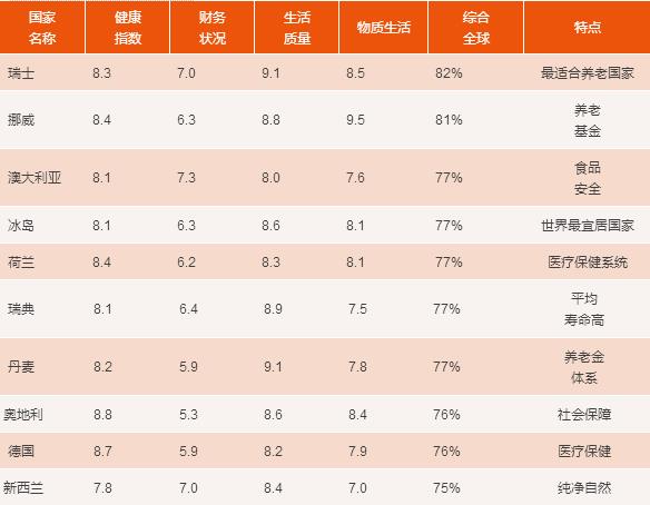 法盛全球資產(chǎn)管理公司(Natixis Global Asset Management),根據(jù)世界銀行、世界衛(wèi)生組織等提供的數(shù)據(jù),從醫(yī)療環(huán)境、預(yù)期壽命、金融穩(wěn)定和生活質(zhì)量等20個(gè)方面,綜合比較了全球150個(gè)國家的養(yǎng)老情況,評出了前十名: