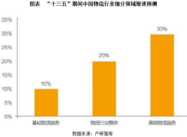 而高端物流服務(wù)增速將可以達(dá)到30%以上的增長。供應(yīng)鏈管理、專業(yè)第三方物流和冷鏈服務(wù)等高端業(yè)態(tài)將迎來快速發(fā)展期,考慮到物流行業(yè)整體增速可以達(dá)到20%以及基礎(chǔ)物流服務(wù)增速僅在10%左右,預(yù)計“十三五”期間高端物流服務(wù)將可以迎來年均30%左右的持續(xù)增長。