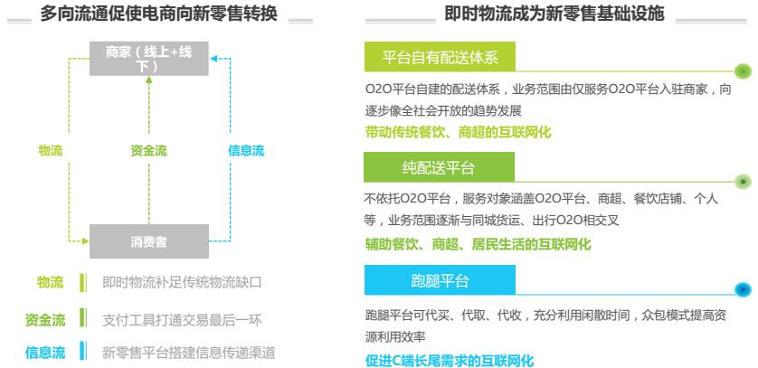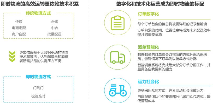 快速、及時、實時的物流實現(xiàn)路徑是“新零售” 的必備條件,即時物流在居民生活中扮演著越來越重要的角色,物流能力向下滲透觸及居民生活的方方面面,為衣食住行的全方位互聯(lián)網(wǎng)化提供現(xiàn)實基礎(chǔ),未來新零售趨勢下的即時需求比重會逐步增加。
