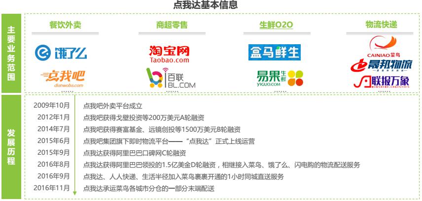 即時物流平臺點我達(dá)脫胎于外賣平臺點我吧,憑借出色的運(yùn)營和調(diào)度能力快速發(fā)展。2016年7月,獲得阿里領(lǐng)投的1.5億美金D輪融資,并接入菜鳥網(wǎng)絡(luò)城市配送體系,成為阿里物流布局戰(zhàn)略重點。相較于其他即時物流平臺,點我達(dá)擁有淘系電商龐大的資源背景作為支撐,訂單來源除O2O平臺之外還包括物流、電商等,在競爭中占據(jù)絕對優(yōu)勢。