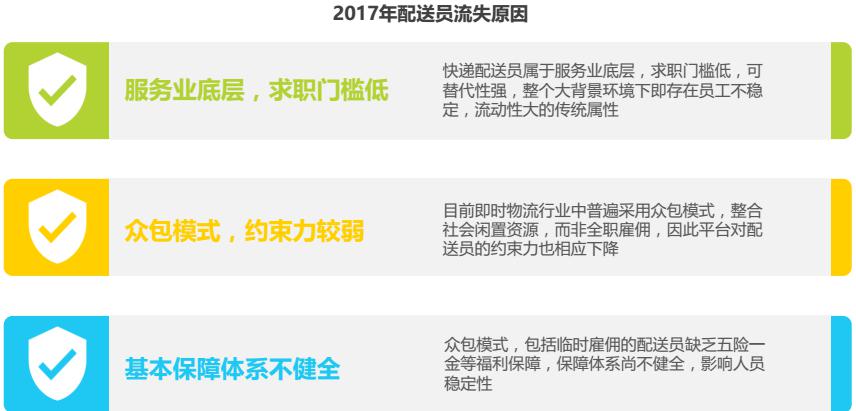 維持穩(wěn)定的配送員團(tuán)隊,對于配送平臺的發(fā)展至關(guān)重要。但目前即時物流行業(yè)存在配送人員流失率高的難題。究其原因,存在以下三方面的因素:求職門檻低、可替代性強(qiáng),平臺對人員的約束力較弱以及基本保障體系不健全。