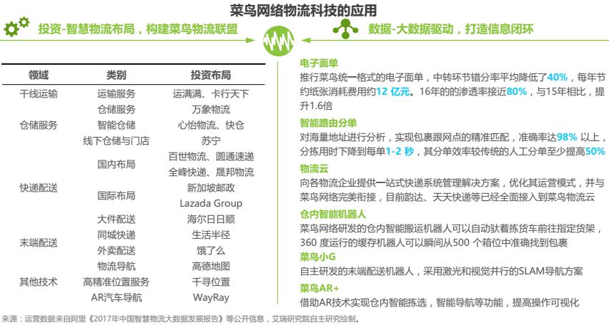 菜鳥網(wǎng)絡(luò)成立于2013年5月,定位于以數(shù)據(jù)驅(qū)動、社會化協(xié)同的物流及供應(yīng)鏈平臺。主要業(yè)務(wù)有倉配網(wǎng)絡(luò)、跨境網(wǎng)絡(luò)、快遞平臺和ET.物流實驗室,以覆蓋全國的倉配網(wǎng)絡(luò)和大數(shù)據(jù)決策平臺為基礎(chǔ),構(gòu)建專業(yè)高效的供應(yīng)鏈服務(wù)。為了提高網(wǎng)絡(luò)效率,一方面菜鳥以投資參股的形式構(gòu)建菜鳥聯(lián)盟,另一方面加大科技研發(fā)的投入,積極布局智慧物流。
