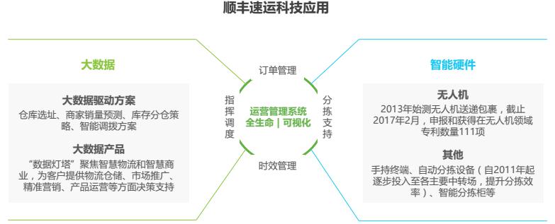 順豐速運(yùn)成立于1993年,截止2016年12月,順豐控股業(yè)務(wù)覆蓋全國331個地級市、2620個縣區(qū)級城市,近13000個自營網(wǎng)點。順豐速運(yùn)業(yè)務(wù)包括國際業(yè)務(wù)、同城配送、冷運(yùn)、重貨(陸路&航運(yùn))等。順豐一貫重視在信息化領(lǐng)域的投入,負(fù)責(zé)集團(tuán)信息系統(tǒng)研發(fā)與運(yùn)維的科技人員超過2,000名,16年信息技術(shù)費投入2.6億、占營業(yè)成本0.57%,相較15年提升0.08個百分點。14-16年來,順豐控股申報和獲得的專利523項,軟件著作權(quán)200多項。未來,順豐還將繼續(xù)擴(kuò)大在科技領(lǐng)域投入,不斷提高各方面的科技與智能化水平。
