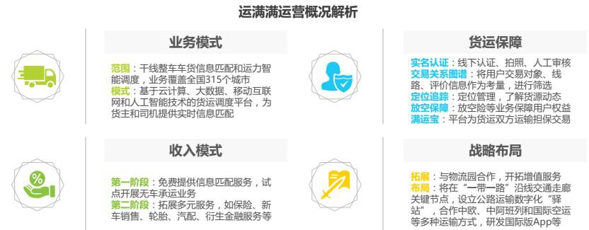 運(yùn)滿滿成立于2013年,是基于云計算、大數(shù)據(jù)、移動互聯(lián)網(wǎng)和人工智能技術(shù)開發(fā)的貨運(yùn)調(diào)度平臺,為貨主和司機(jī)提供實時信息匹配,減少貨運(yùn)空載率、提高物流運(yùn)行效率。由于模式相近,運(yùn)滿滿被業(yè)界稱為“貨運(yùn)版的滴滴”,成立3年來共獲得7輪融資,目前估值超過10億美金。截止2017年9月底,平臺實名注冊重卡司機(jī)400余萬、貨主100余萬,業(yè)務(wù)覆蓋全國 315 個城市。運(yùn)滿滿最新推出擔(dān)保交易產(chǎn)品“滿運(yùn)寶”,為貨運(yùn)雙方提供運(yùn)費擔(dān)保。此外,運(yùn)滿滿還與阿里云、菜鳥、螞蟻金服、平安保險、中國聯(lián)通、中國重汽等開展深度戰(zhàn)略合作,通過跨界融合,不斷推出創(chuàng)新產(chǎn)品和服務(wù)。未來,運(yùn)滿滿將借助人工智能、無人駕駛、區(qū)塊鏈等技術(shù)驅(qū)動,提供貫穿全產(chǎn)業(yè)鏈的線上線下服務(wù),構(gòu)建公路物流生態(tài)圈,打造綜合性的貨運(yùn)平臺。