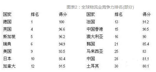 國家的物流業(yè)總體競爭力不僅取決于基礎(chǔ)設(shè)施建設(shè)水平,還取決于整個物流產(chǎn)業(yè)的管理水平、第三方物流企業(yè)發(fā)展水平和第四方物流企業(yè)的整合能力。從國家層面來看,世界銀行發(fā)布的報告顯示,在全球物流業(yè)競爭力排行榜(Logistics Performance Index)中,歐洲國家表現(xiàn)最為突出,前20名中超過60%的企業(yè)來自歐洲,亞洲物流業(yè)競爭力最強(qiáng)的國家/地區(qū)是日本(排名第十),其次為中國香港和臺灣地區(qū),中國大陸在全球僅排名第28??傮w而言,發(fā)展中國家在基礎(chǔ)設(shè)施、國際運(yùn)輸、物流能力、交貨及時性等方面還與歐美等發(fā)達(dá)國家存在較大的差距,物流業(yè)的全球競爭能力還十分有限。