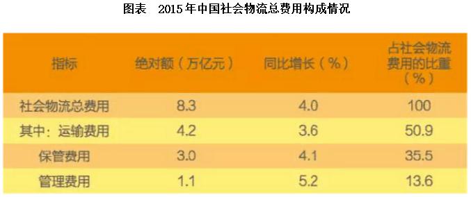 2014年社會物流總費用10.6萬億元,同比增長6.9%。社會物流總費用與GDP的比率為16.6%,比上年下降0.3個百分點。其中,運(yùn)輸費用5.6萬億元,同比增長6.6%,占社會物流總費用的比重為52.9%;保管費用3.7萬億元,同比增長7.0%,占社會物流總費用的比重為34.9%;管理費用1.3萬億元,同比增長7.9%,占社會物流總費用的比重為12.2%。