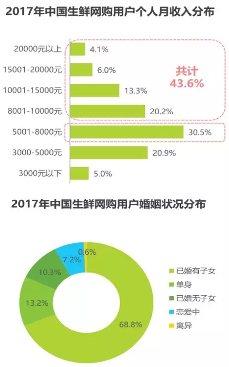 從用戶屬性來看,體驗過創(chuàng)新模式的用戶中高學(xué)歷、高家庭月收入的人群占比均高于整體生鮮網(wǎng)購用戶,與創(chuàng)新模式中高端消費者的定位相吻合。體驗過創(chuàng)新模式的用戶中78.2%擁有大學(xué)本科及以上學(xué)歷,80.7%的用戶家庭月收入在10000元以上,其中家庭月收入在10001-15000元的用戶最多,占比達28.2%。