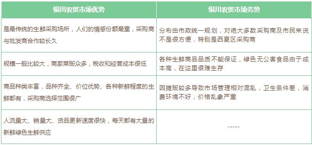 在銀川本地,主城范圍內(nèi)除最早建立的北環(huán)批發(fā)市場外,再沒有專業(yè)的大型生鮮批發(fā)市場,近幾年發(fā)展起來的有:四季鮮果蔬批發(fā)市場、21世紀冷鏈批發(fā)市場、海吉星農(nóng)副產(chǎn)品物流園、潤恒農(nóng)產(chǎn)品市場等都在郊區(qū)。大型農(nóng)產(chǎn)品交易市場是傳統(tǒng)生鮮流通中不可缺少的一環(huán),是各社區(qū)農(nóng)貿(mào)市場及超市生鮮尤其是蔬菜水果的主要來源,具有成交量大、知名度高、社會影響大、流通體系健全、配套完整等優(yōu)勢,但也存在傳統(tǒng)生鮮流通方式的不足。