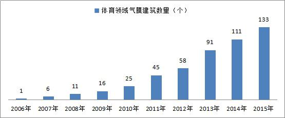 目前,世界上已經(jīng)建成有上萬(wàn)個(gè)氣膜建筑了,2011年以后中國(guó)氣膜場(chǎng)地的數(shù)量迎來(lái)集中爆發(fā)期,全國(guó)每年新增項(xiàng)目數(shù)量基本穩(wěn)定在30個(gè)以上。截至2015年末,我國(guó)氣膜建筑總項(xiàng)目數(shù)達(dá)到215個(gè),建筑面積達(dá)到88.76萬(wàn)平方米;其中,現(xiàn)存的項(xiàng)目數(shù)量和建筑面積分別為197個(gè)和78.60萬(wàn)平方米,現(xiàn)存率在90%左右。氣膜建筑可以應(yīng)用的范圍非常廣闊,但是我國(guó)目前還是作為運(yùn)動(dòng)場(chǎng)館的比較多,市場(chǎng)接受度也比較高。隨著社會(huì)對(duì)環(huán)保的關(guān)注,企業(yè)經(jīng)營(yíng)過(guò)程中環(huán)保的成本要求越來(lái)越高,未來(lái)在工業(yè)領(lǐng)域,氣膜建筑還有更廣泛的應(yīng)用。