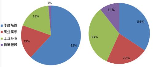 圖表4 氣膜建筑項(xiàng)目數(shù)量(左)、建筑面積(右)各應(yīng)用領(lǐng)域占比