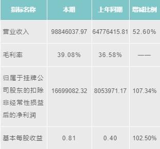 博德維2016年?duì)I業(yè)收入為98846037.97元,增長(zhǎng)52.60%;毛利潤(rùn)為39.08%;歸屬于掛牌公司股東的扣除非經(jīng)常性損益后的凈利潤(rùn)為16699082.32元,增長(zhǎng)107.34%;基本每股收益為0.81元/股,增長(zhǎng)102.50%。